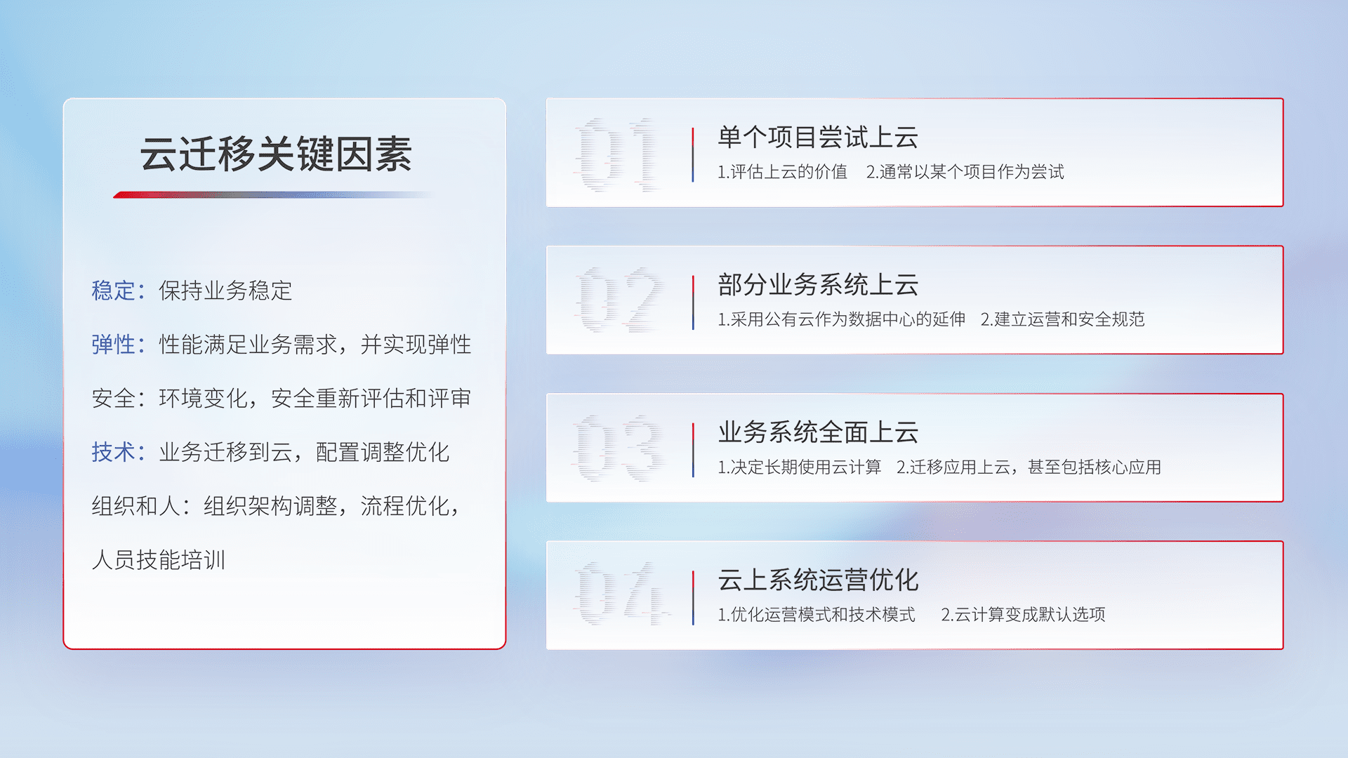 结合实际业务,,从规划设计、、、云平台选型、、、、云原生改造、、数据迁移、、、集成交付,,迁移全过程为客户识别最佳上云路径,,,,做好风险识别管理,,,设计网络架构、、、身份权限、、、安全审计合规、、、、操作审计、、、、日志审计、、、监控告警策略、、、、多站点容灾设计等,,,,对云上基础设施进行整体规划,,,,提升IT治理水平,,以满足弹性、、高可用、、、、高性能的需求。。。。