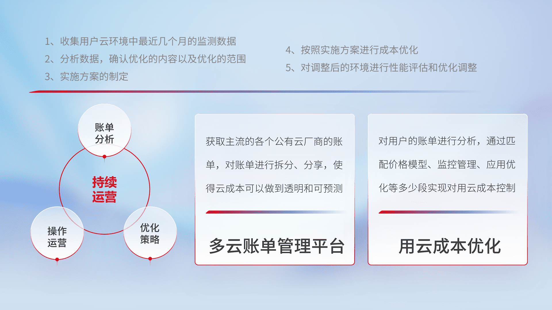 通过多云纳管,,,以统一的资源数据模型把客户的云资源进行抽象和封装,,,,进而实现对多云资源的统一操作,,,,保障云资源管理的可靠性、、、、稳定性与可用性。。。。量身定制化运维内容,,配置、、、、开发运维、、、补丁管理、、备份、、、监控、、认证和访问管理、、、、审计和日常巡检等,,,保障在用云过程中的可靠度,,,,稳定度以及高可用率。。