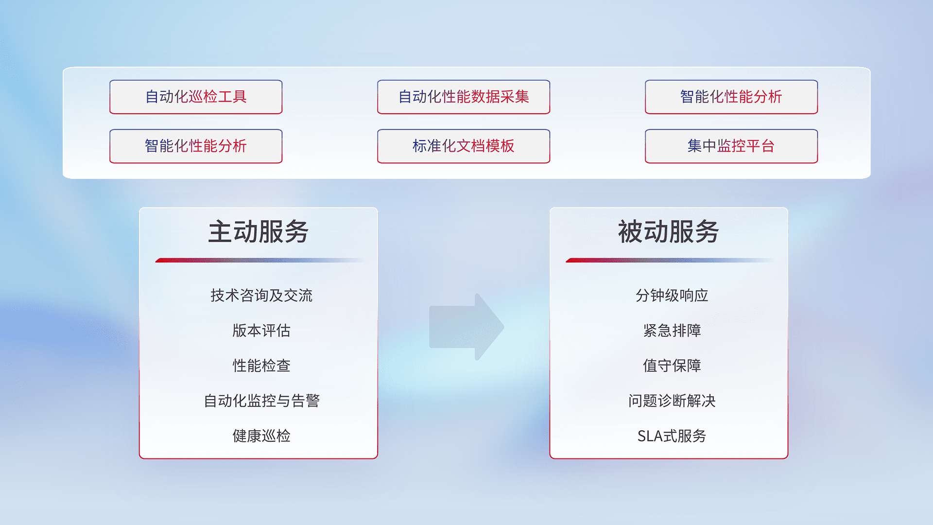 智能化工具和标准化文档,,保障服务质量,,,提供主动服务(包含技术咨询、、、、版本评估、、性能检查、、自动化监控与告警、、、、健康巡检)和被动服务包含(分钟级响应、、紧急排障、、、、值守保障、、问题诊断解决、、、、SLA服务)。。。